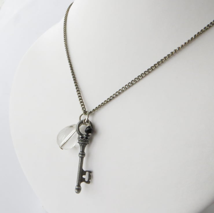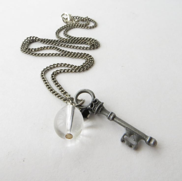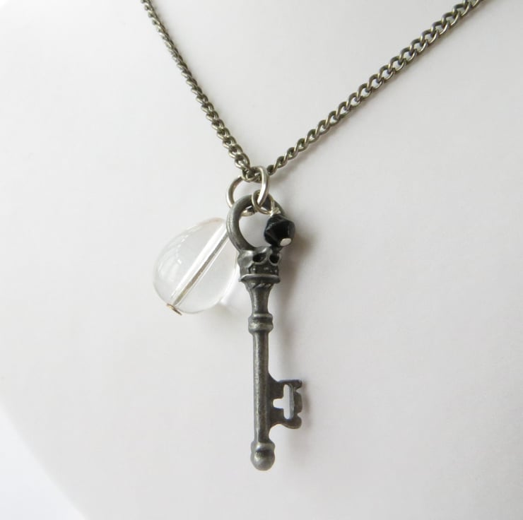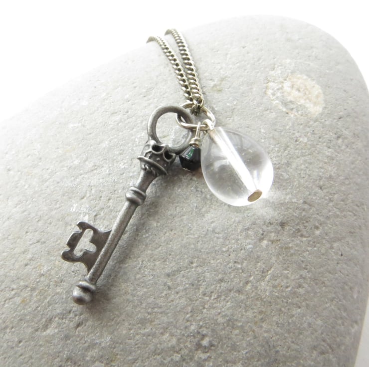 A gorgeously detailed antique silver plated key charm, a clear glass crystal teardrop and a teeny black crystal are suspended together from an oxidised silver plated chain. Perfect for adding a touch of vintage glamour to your wardrobe, I like to think of this as the key to somewhere really special, a secret garden maybe?