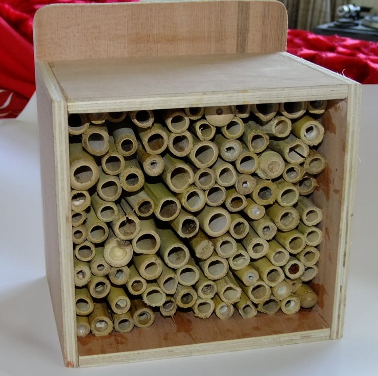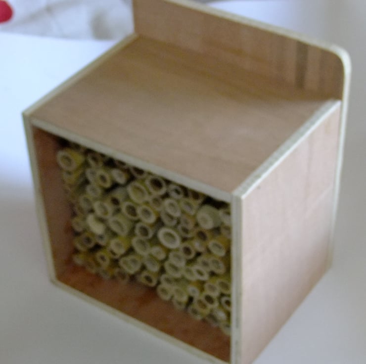 I have made a bug shelter from recycled plywood and bamboo. The box is roughly 5" x 5" and has a hole drilled in the backing so that it can be hung up in the garden, somewhere where the creepy crawlies hang out and chill. Screw supplied.
