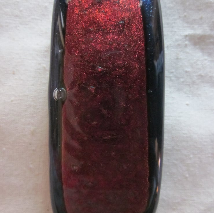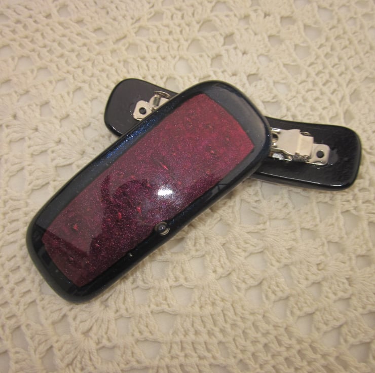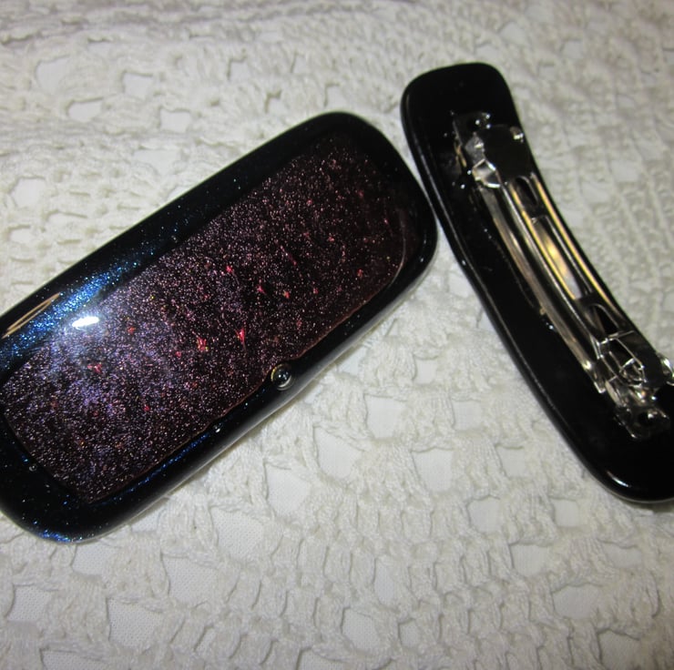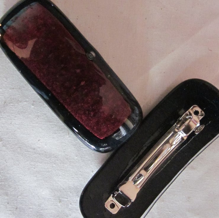 This cabochon has a deep copper dichroic shimmer, with a hint of plum. This black based glass has been fused onto midnight aventurine glass, which is complements beautifully - one of my favourite colour combinations. The aventurine glass naturally has a delicate shimmer. It is fitted with a silver coloured metal barrette clip. It is approximately 10 cms long. This quite a large clip and suitable for someone with thicker or longer hair.