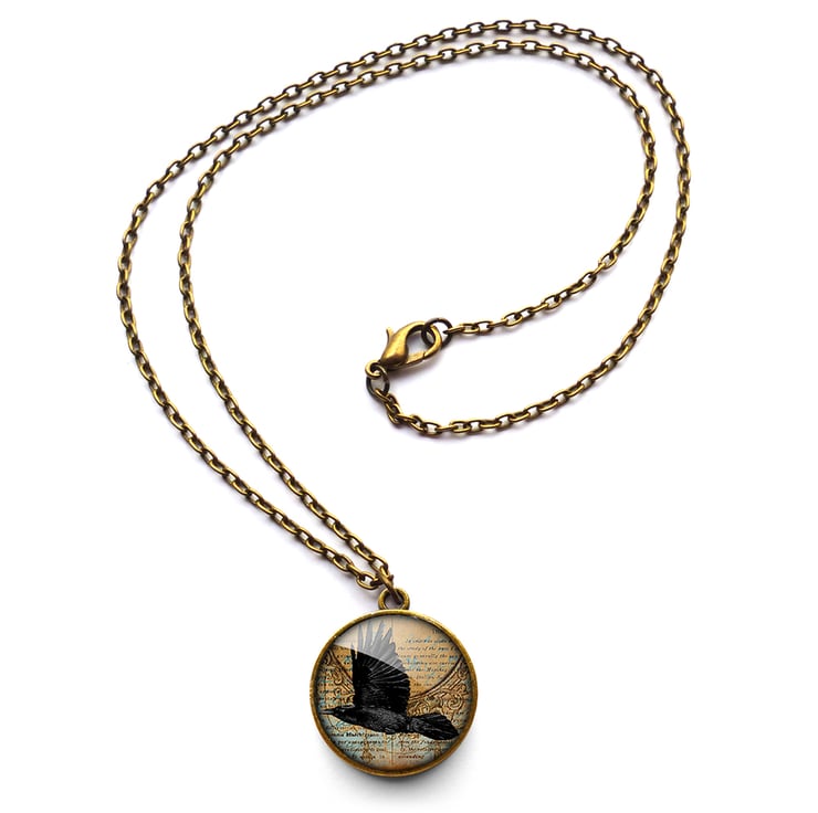 A gorgeous necklace featuring a digital collage of a raven in flight on a vintage style background. This design is part of the 'Roses and Ravens' range.
