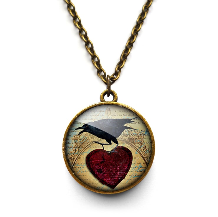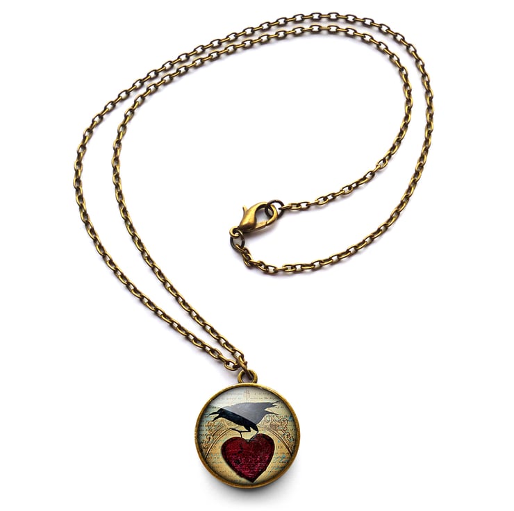 A gorgeous necklace featuring a digital collage of a raven and red heart on a vintage style background. This design is part of the 'Roses and Ravens' range.
