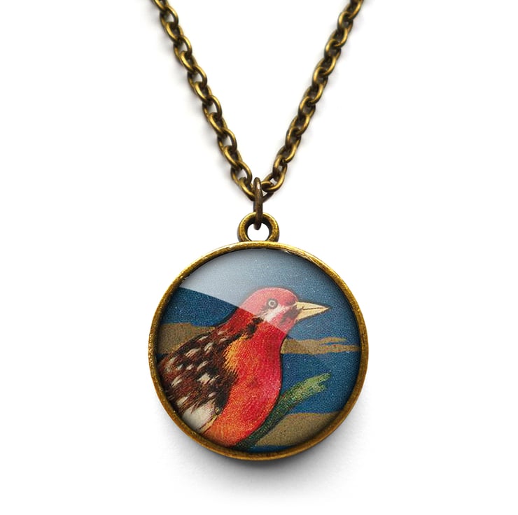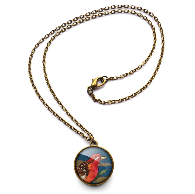 A gorgeous necklace featuring an image of a bird taken from a vintage scrap. This design is part of 'The Birds' range.