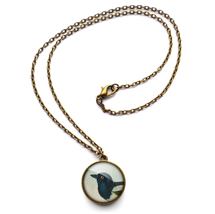 A gorgeous necklace featuring an image of a magpie taken from a vintage scrap. This design is part of 'The Birds' range.