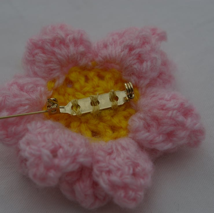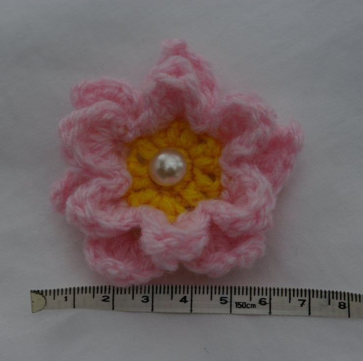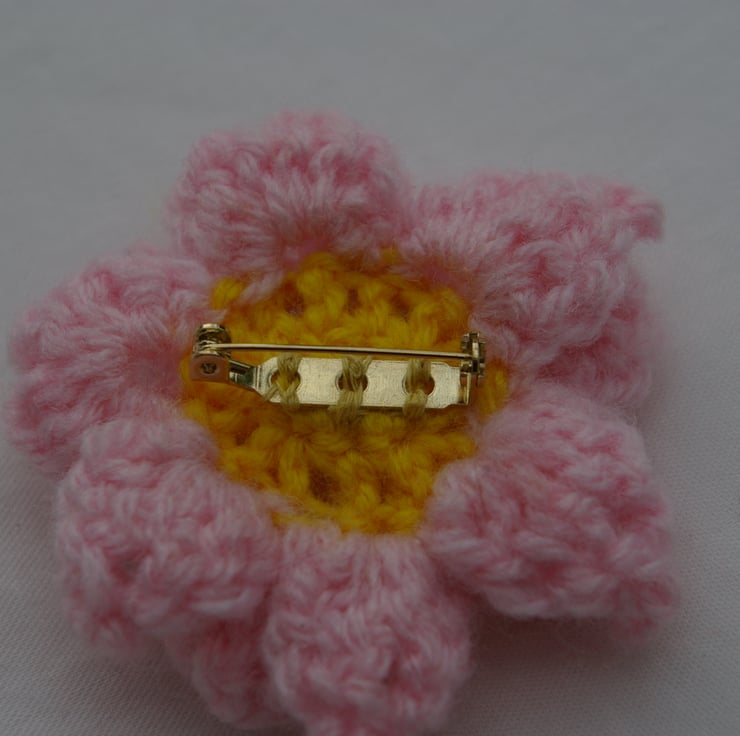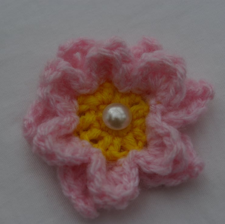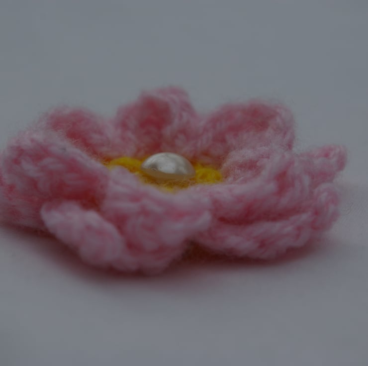 A hand made pink crochet flower brooch. This pretty little brooch has two layers of crochet pink flower petals which are crocheted to a yellow centre. Both layers have six individual flower petals. Into the centre of the flower brooch a small pearlescent white bobble button has been hand sewn.
