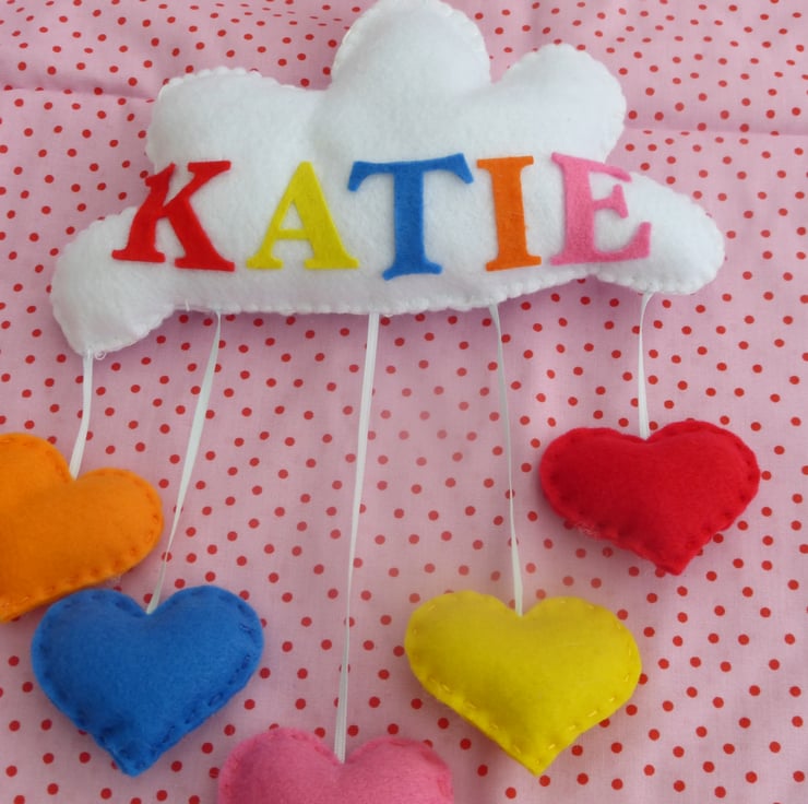 A padded felt Personalised cloud door hanger with rainbow hearts, they look great hanging in their bedrooms, or can hang on bedroom door.