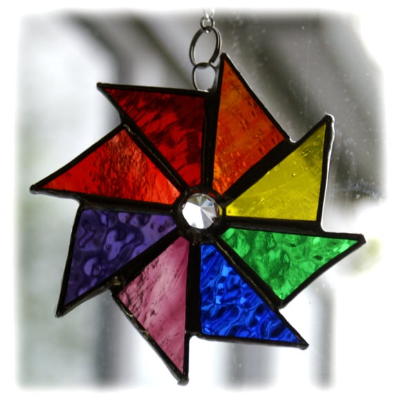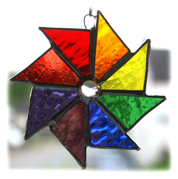 An 8-point wheel made from triangles of glass in all the lovely colours of the rainbow.