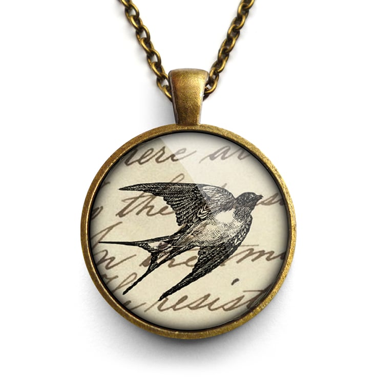 A gorgeous necklace featuring an image of a swallow taken from a Victorian book illustration, combined with a script background. This design is part of the 'Eclectic Range'.