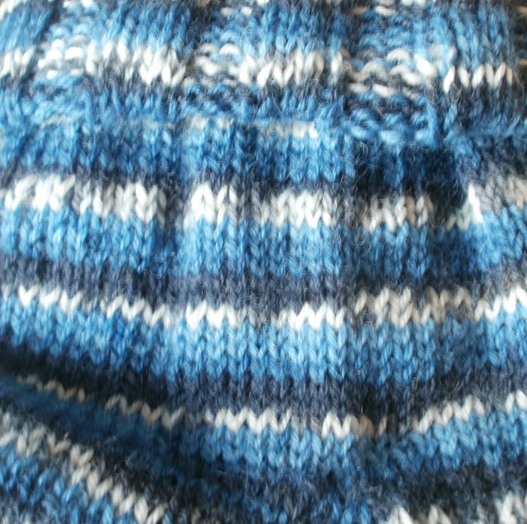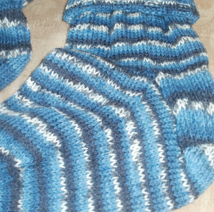 Lovely ankle length socks - knitted with a long cuff which makes them a bit slouchy. Ideal for anyone with circulation problems as there's no elastic to cut into you. Or just for lounging around in. Made on five needles, so no seams either. Fits up to a size 7 foot comfortably.
