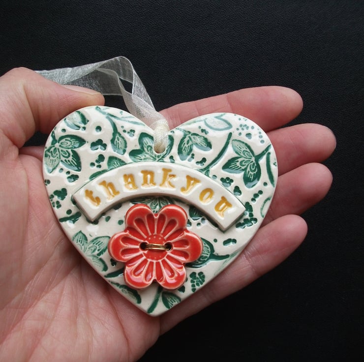 This cute little hanging heart has been made from white earthenware clay and embossed with a leafy design.