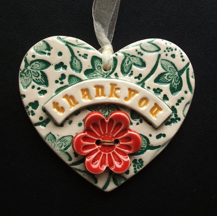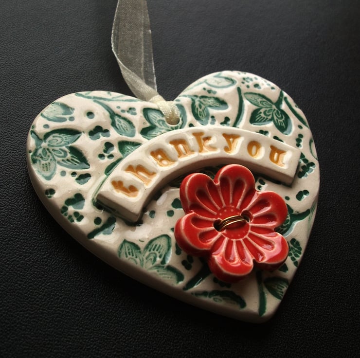 It is finished with a large flower shaped ceramic button that is attached to the heart with gold coloured wire.