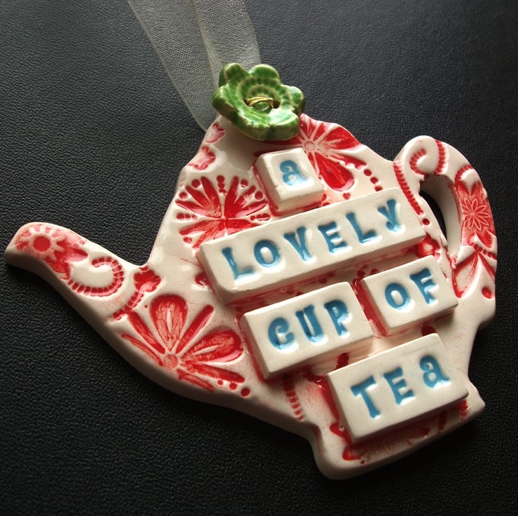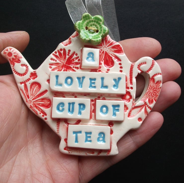 This little hanging teapot decoration is made from white earthenware clay and has the words A lovely cup of tea on it.