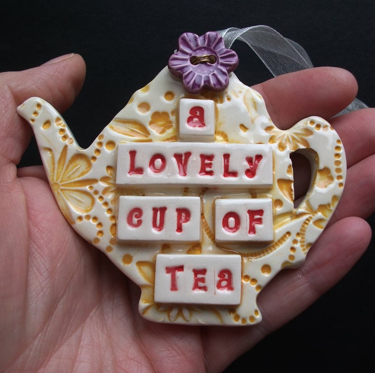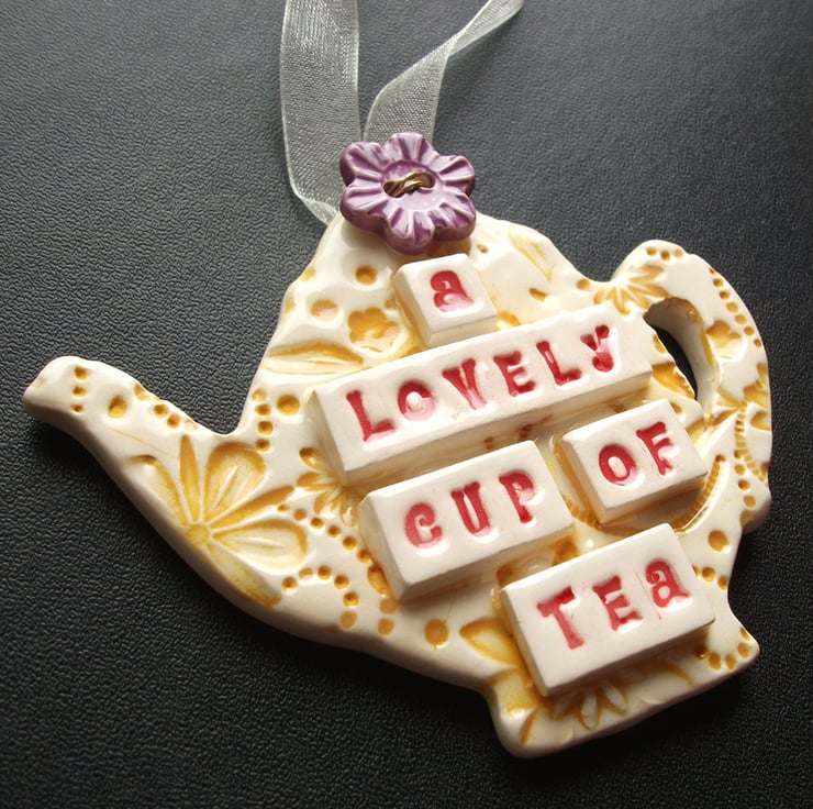 This little hanging teapot decoration is made from white earthenware clay and has the words A lovely cup of tea on it.