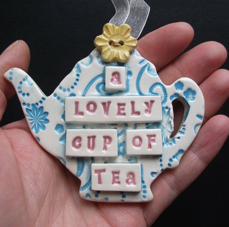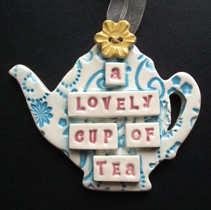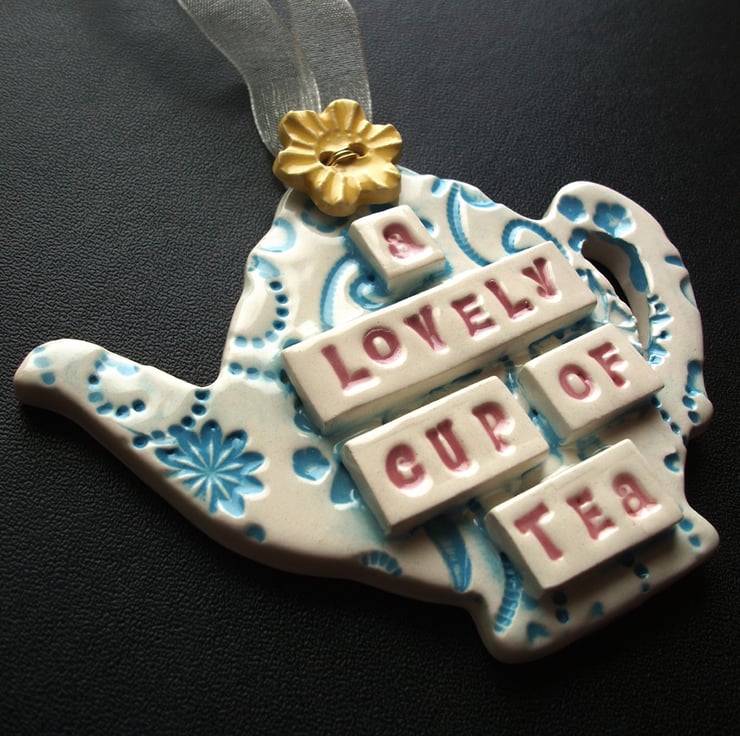 This little hanging teapot decoration is made from white earthenware clay and has the words A lovely cup of tea on it.
