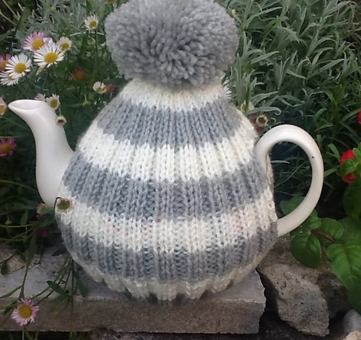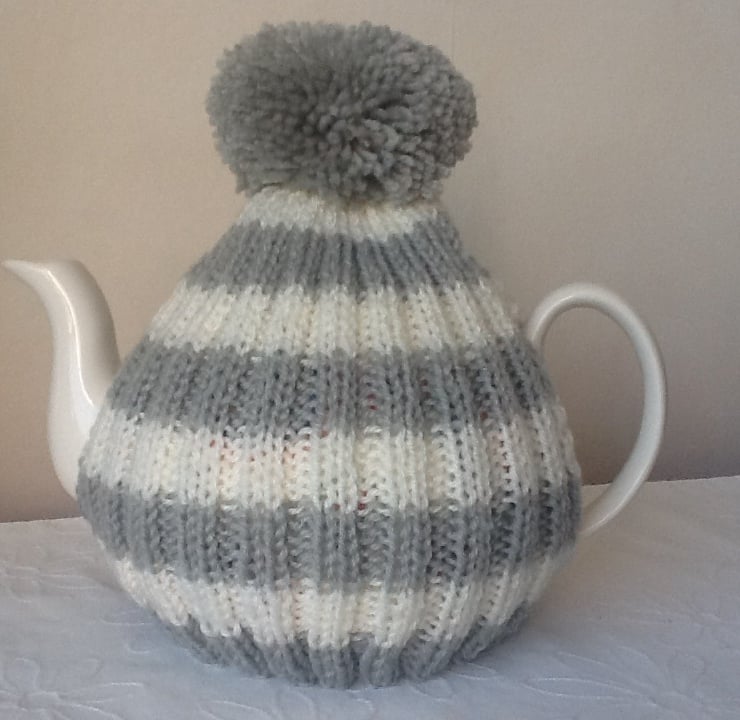 The tea cosy featured is in grey and cream stripped variety.