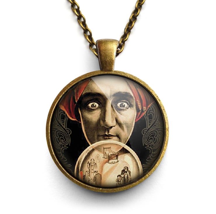 A gorgeous necklace featuring a wonderful vintage image of a fortune teller gazing into a crystal ball. This design is part of the 'Dark Journey' range.