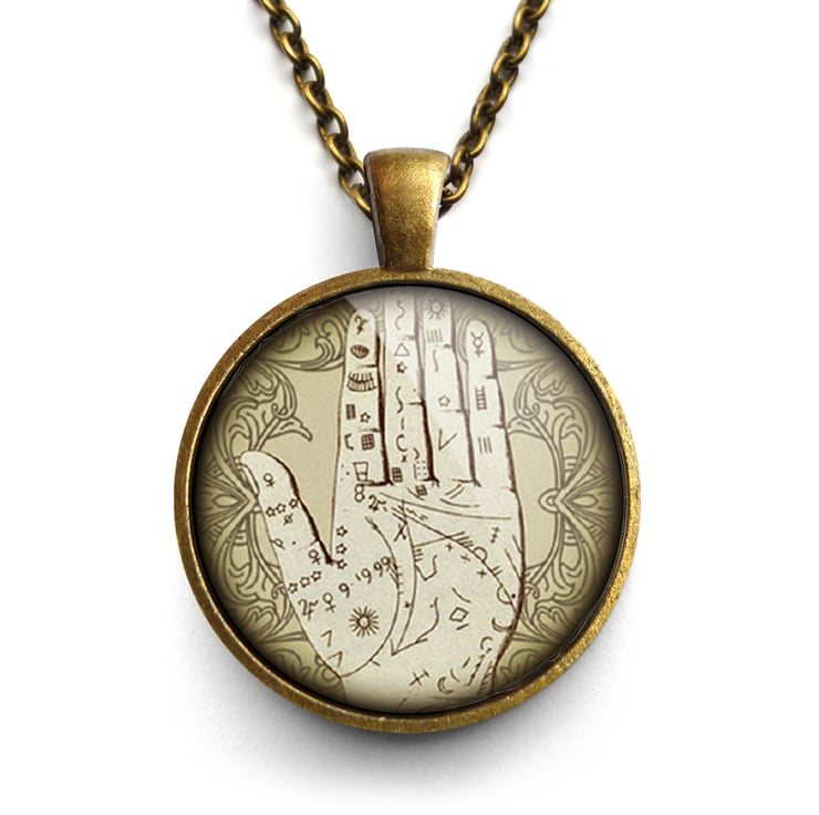 A gorgeous necklace featuring a Victorian image of a palmistry hand. Palmistry is the art of foretelling a person's future by reading the palm of their hand. This design is part of the 'Dark Journey' range.