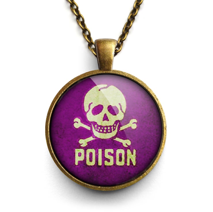 A gorgeous necklace featuring an image of a vintage poison warning. This design is part of the 'Dark Journey' range.