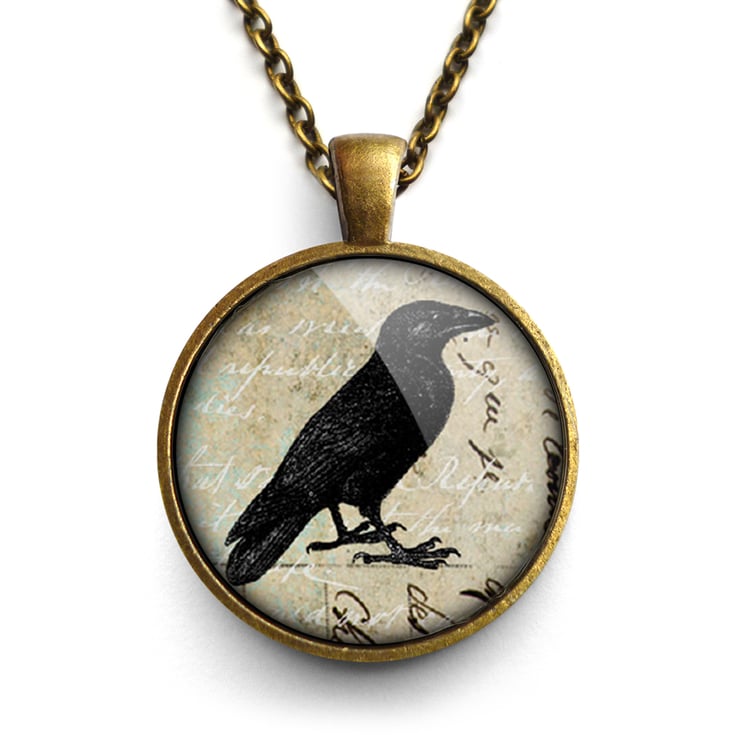 A gorgeous necklace featuring a digital collage of a raven on a calligraphy script background. This design is part of the 'Roses and Ravens' range.