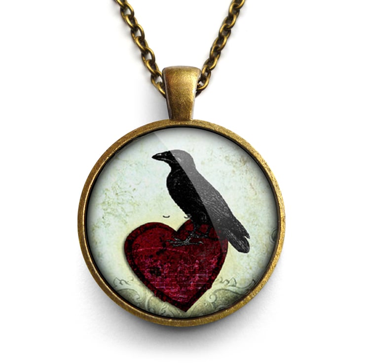 A gorgeous necklace featuring a digital collage of a raven and red heart on a vintage style background. This design is part of the 'Roses and Ravens' range.