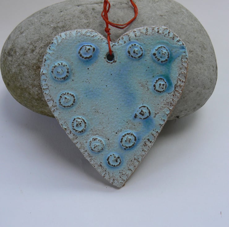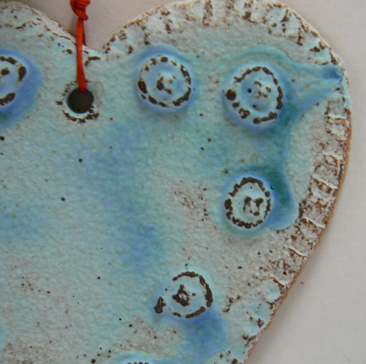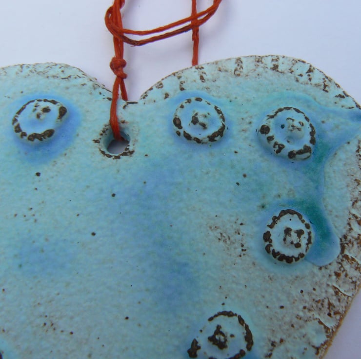 A stoneware ceramic heart with impressed decoration. Buff groogged clay gives a depth to the decoration which is highlighted with a dry turquoise glaze.