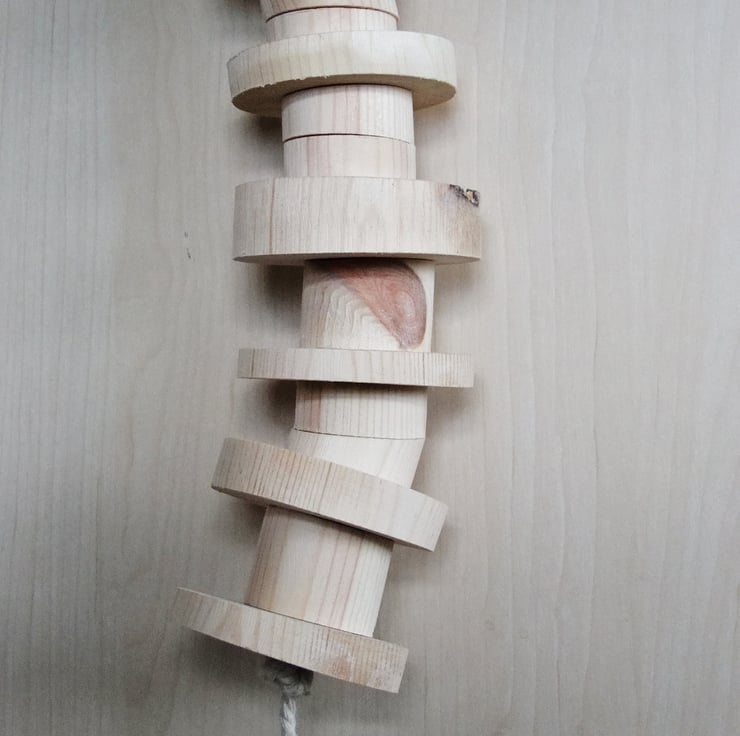 One of my hobbies is to make wooden bird toys, this one is a simple version made up of sixteen round pieces of smooth pine threaded onto a central white piece of cord, I have put a washer on either end so that it is easy to hang in a cage or aviary.