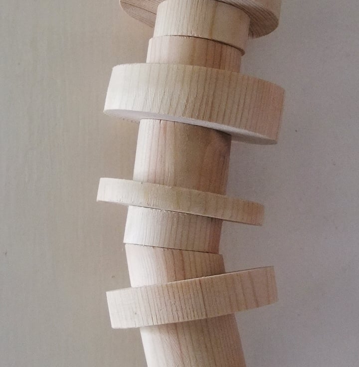 Toy for a caged bird, made from different sized round pieces of smooth pine.