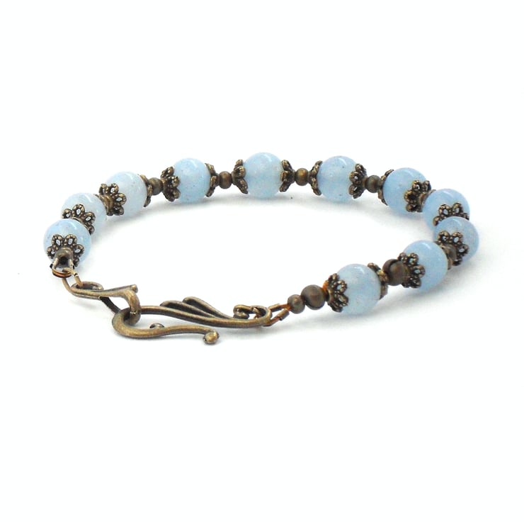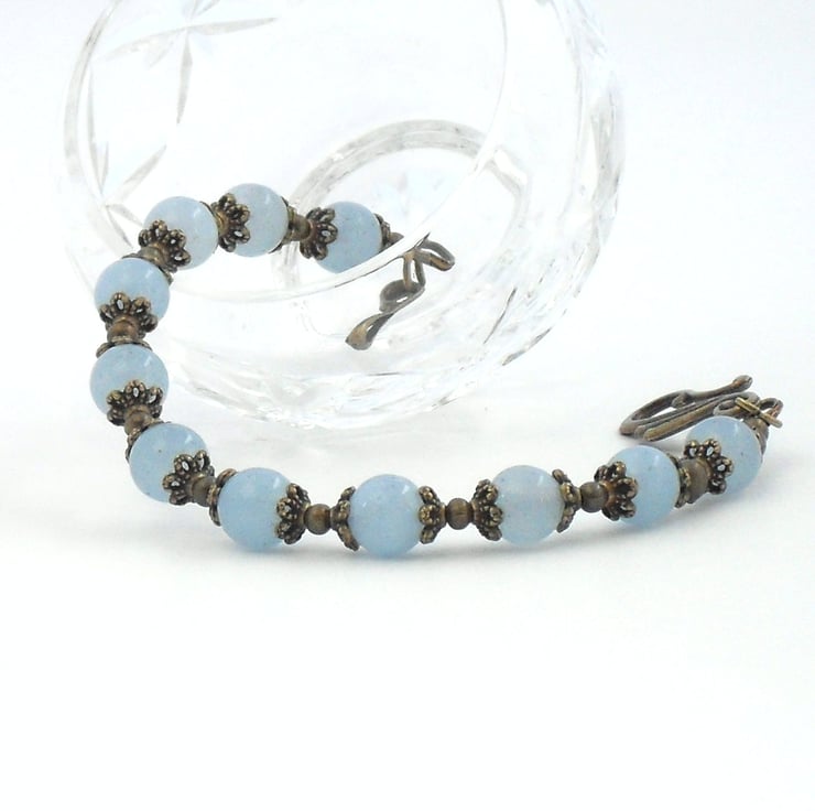 Bronze beads and beadcaps are the perfect complement to these lovely soft blue jade semi-precious gemstone beads in this unique handmade bracelet.
