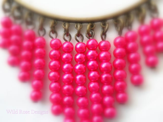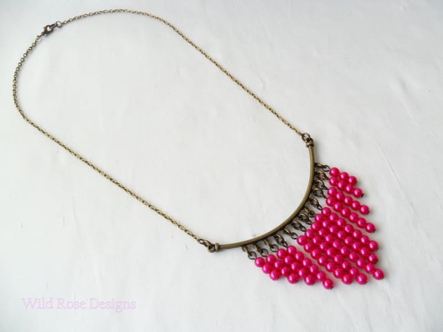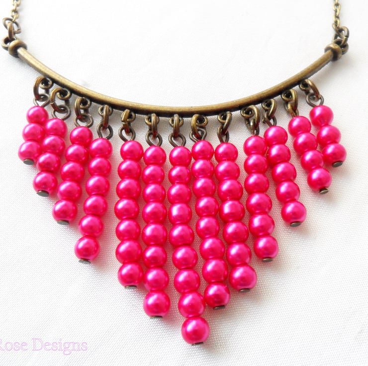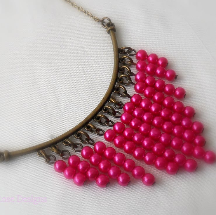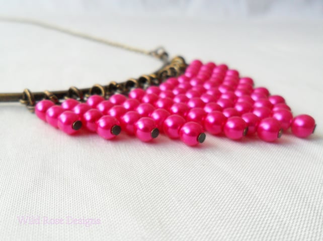 A graduated cascade of 4 mm Fuchsia pink glass pearls, falls from a curved bronze connector which is attached to a bronze chain. The necklace measures about 20" (51 cm) long and fastens with a small trigger clasp.