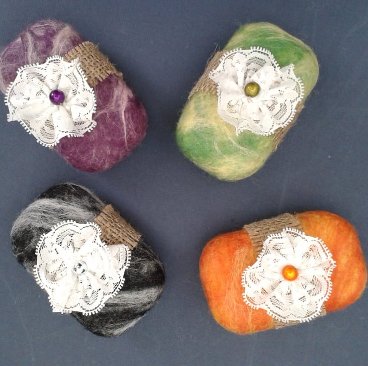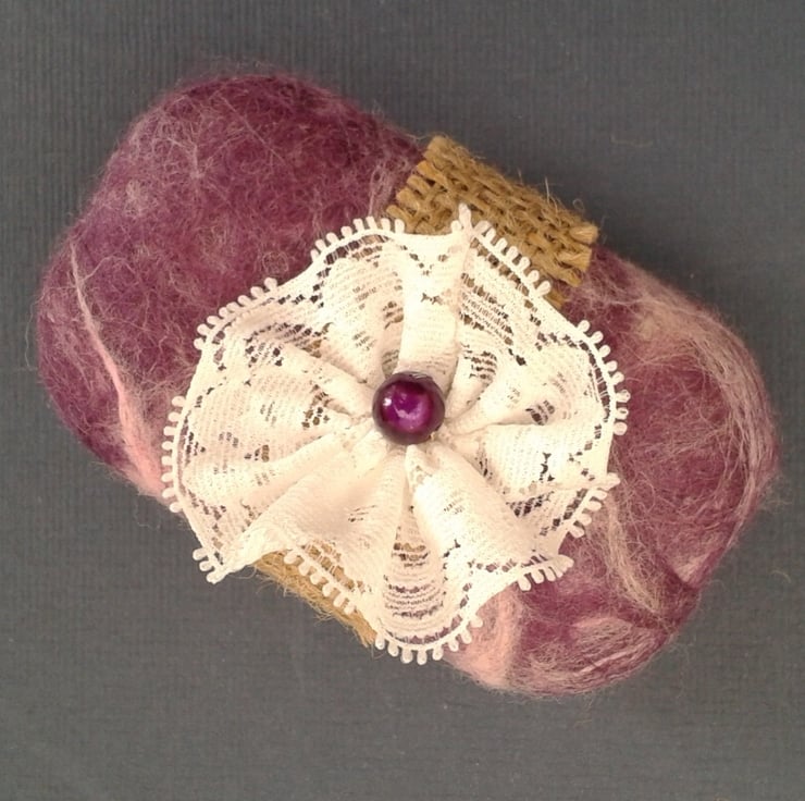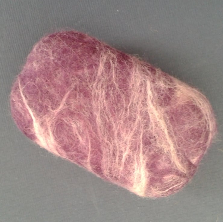 Beautiful gently exfoliating felted soap. A generic moisturising soap bar has been wrapped in contrasting purple and pink shades of merino wool which has then been felted to provide a snug cover for the soap. When wet the lather comes up through the felt layer while the slightly rough (but still soft) woollen layer gives a gentle exfoliating action. When the soap is all used up you are left with a pretty felted washcloth.