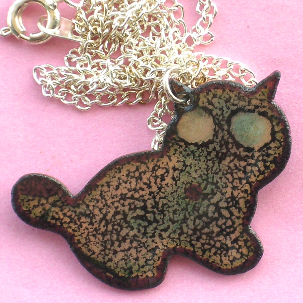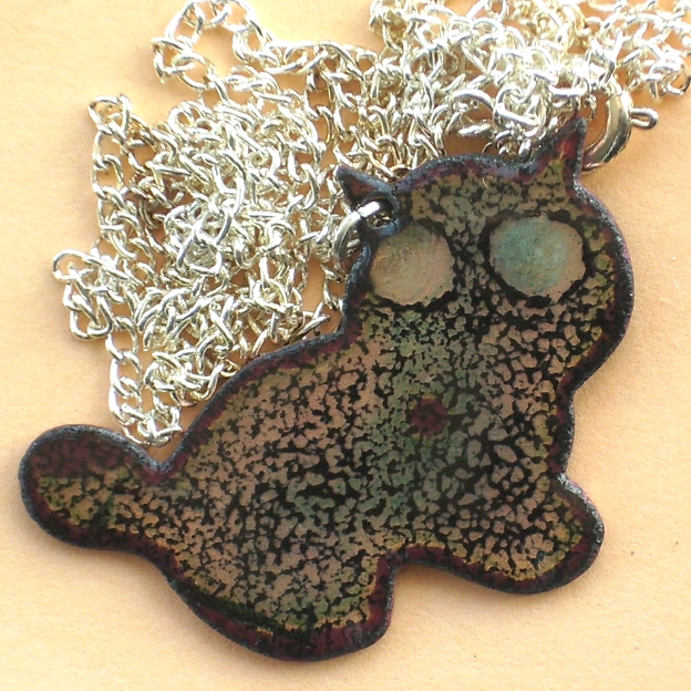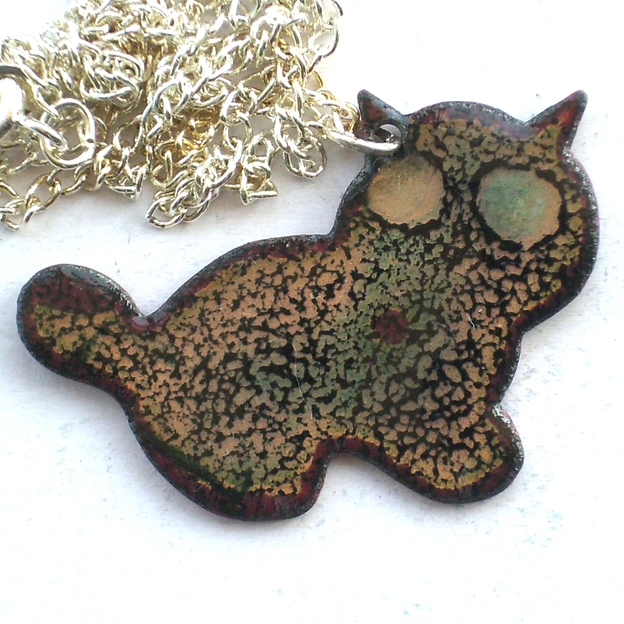 This kitten is black enamel over clear, giving a tabby effect. The kitten's eyes are made with green glass beads fired over the clear enamel.