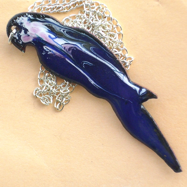 The parrot is counter enamelled. It is mounted on silver plate 45cm (18 inch) curb chain fastened with a simple bolt ring.