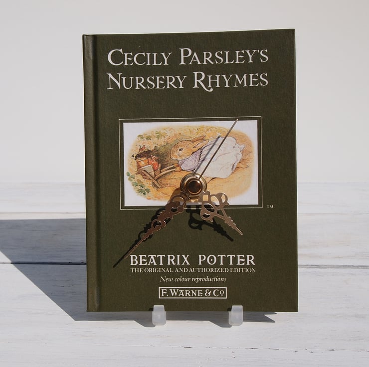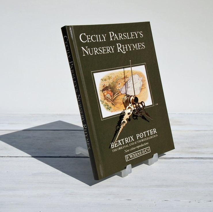 This clock has been created from an original copy of the book Cecily Parsley's Nursery Rhymes by Beatrix Potter. The book has been read and enjoyed by a previous owner so it may show light wear to the cover. This edition dates from the 1980s.