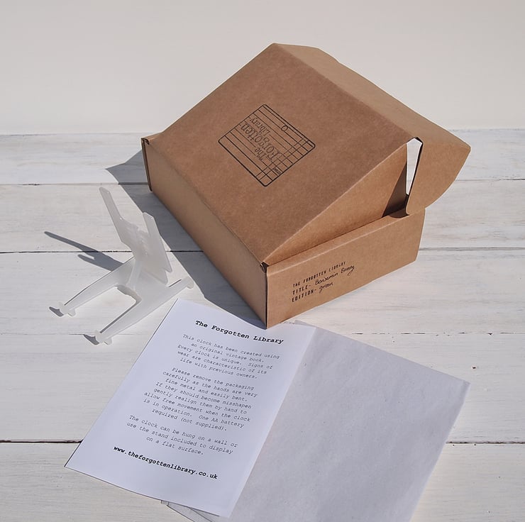 The picture of the box, insert and stand is a standard stock photograph as the same style of box is used for each clock. If you are looking closely at the image you may notice the book title is different, don't worry your clock will be correctly boxed and labeled.