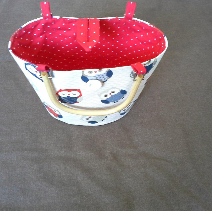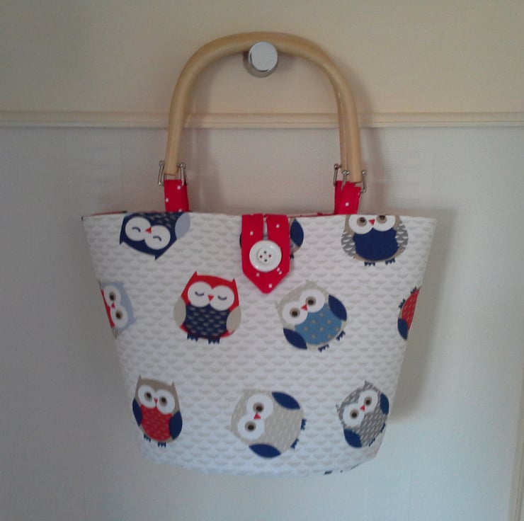 The background colour is white and the owls are blues and red. It is fully lined with a vibrant scarlet red and white spotted poly cotton material and has a button and tab fastening.