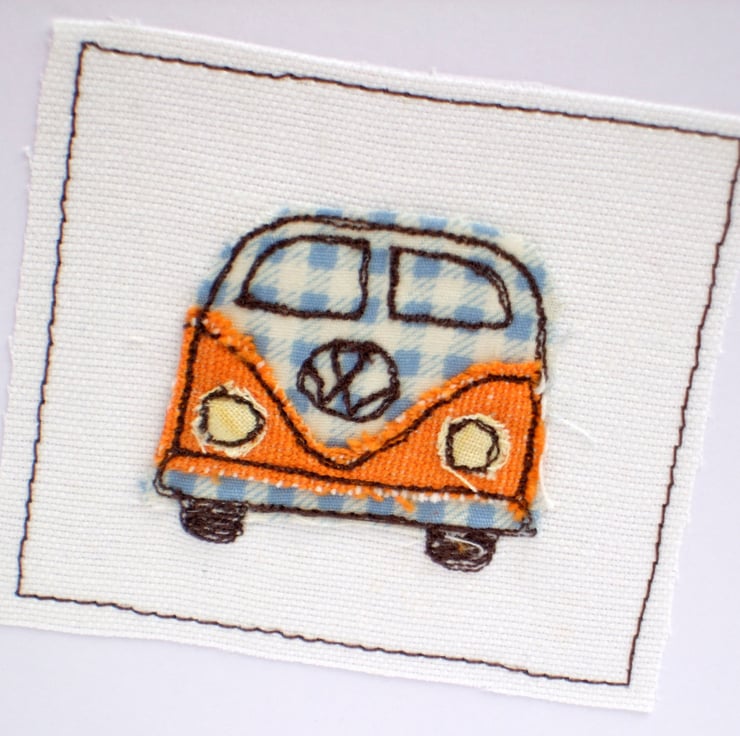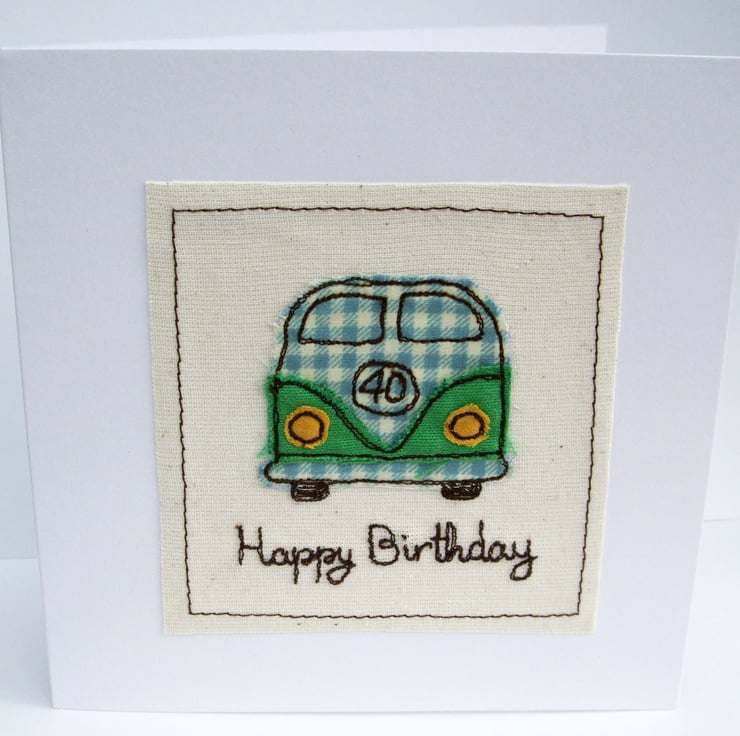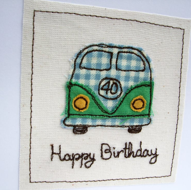 For the campervan fan this is the perfect birthday card! The traditional VW camper or kombie has been freestyle machine embroidered using different coloured fabrics and Happy Birthday has been added under the camper.