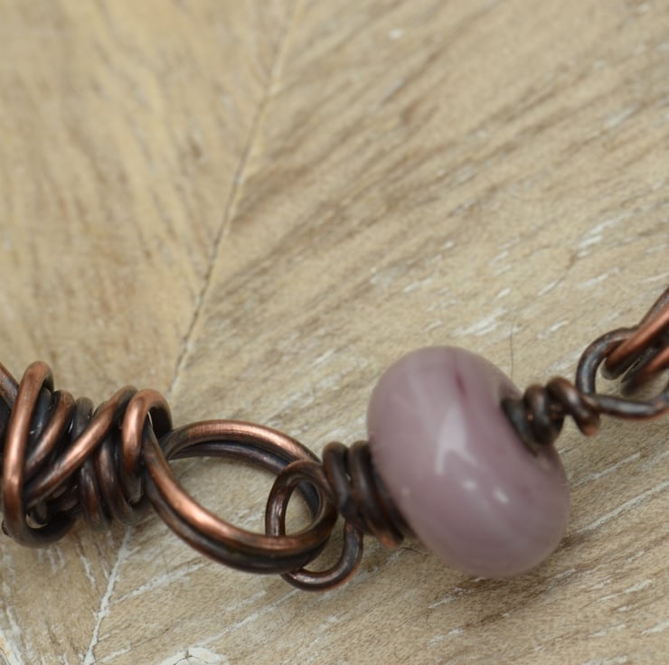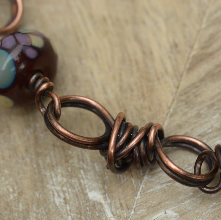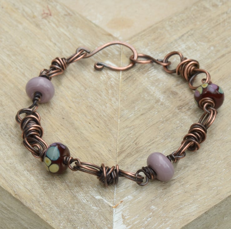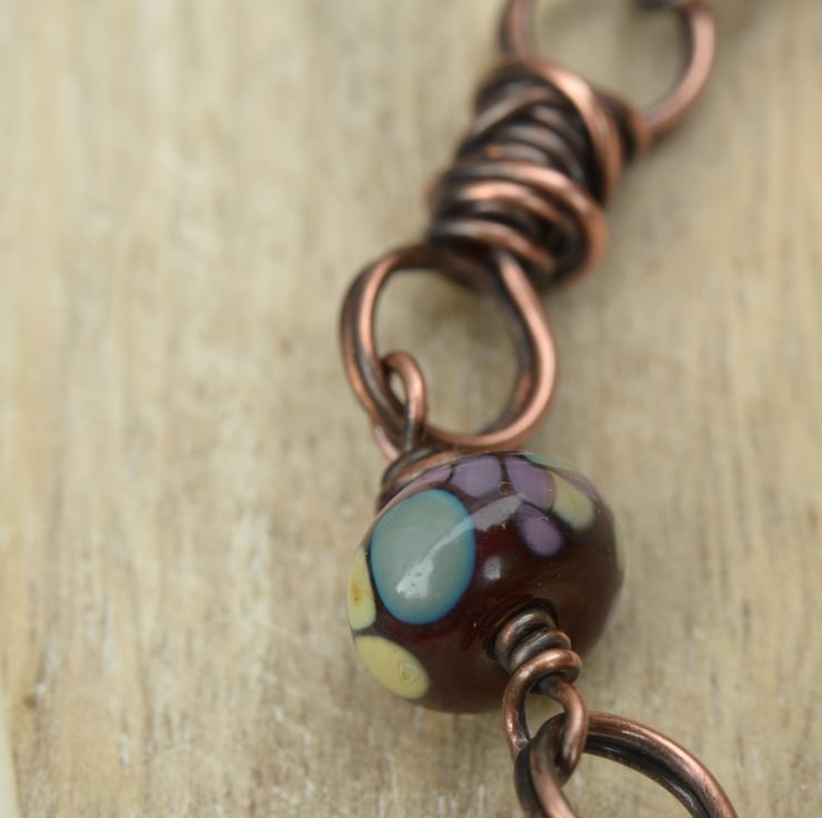 A mix of Lampwork glass beads adorn this handmade copper bracelet. I have added little handmade copper twist links and finished with a hook and eye clasp. Colours in the lampwork glass are a deep burgundy base with flecks of green, blue and purple and plain opaque lilac handmade by UK lampwork artist Yvonne Johnson.