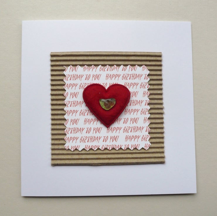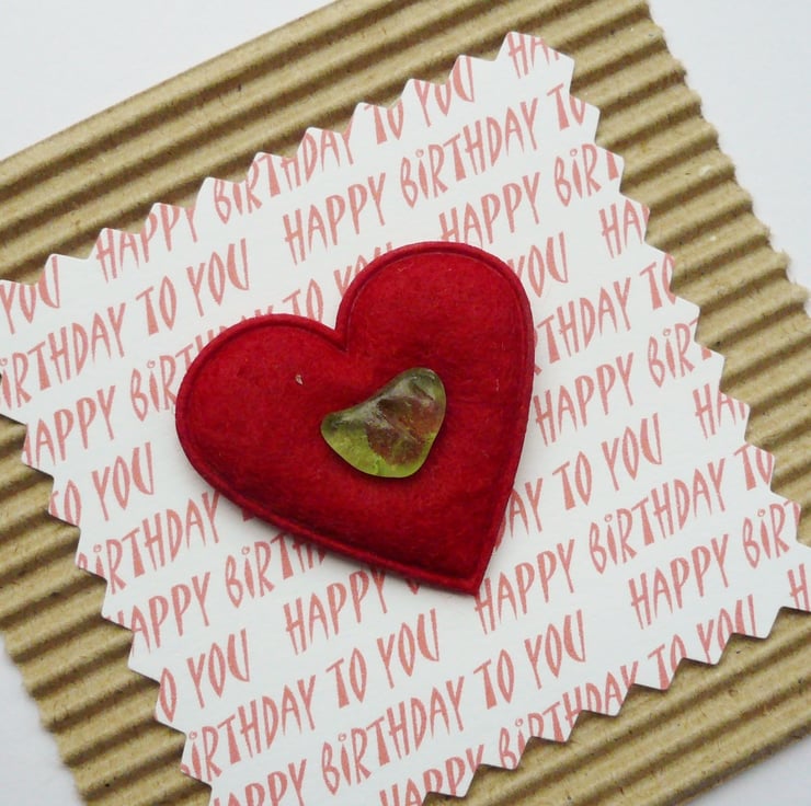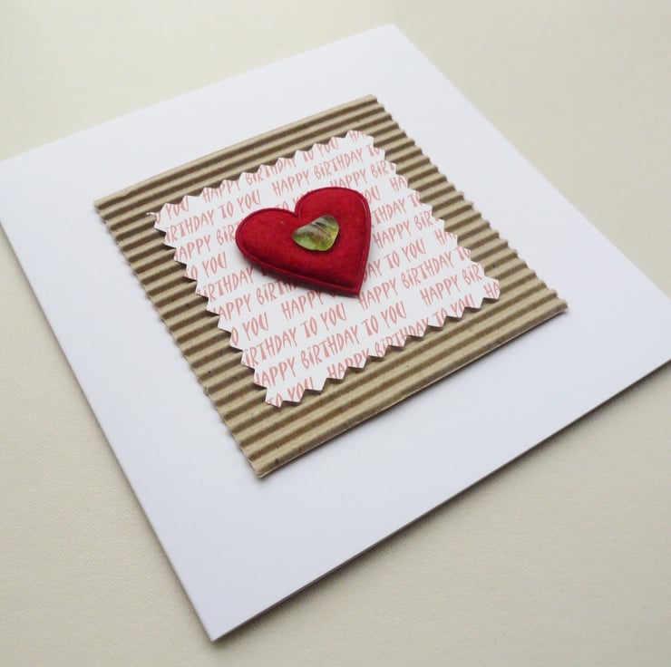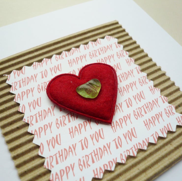 This handmade greetings card is made up of a layer of natural coloured corrugated card and red and white 'Happy Birthday to You' printed background paper. On top of that is a 30mm red felt heart embellishment with a heart shaped piece of green sea glass set in the centre.