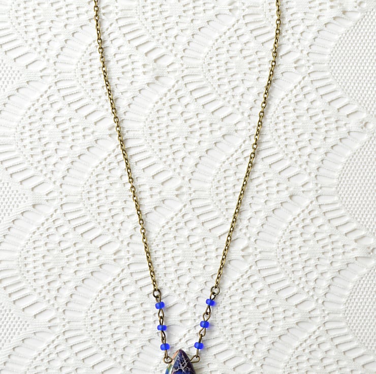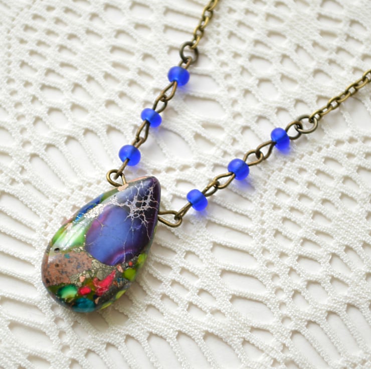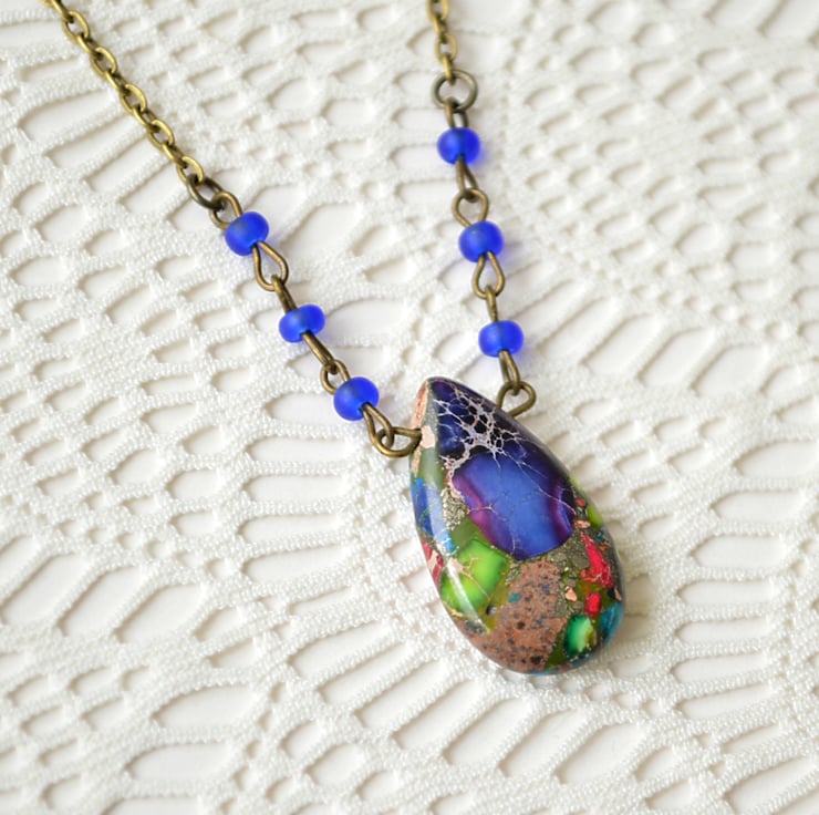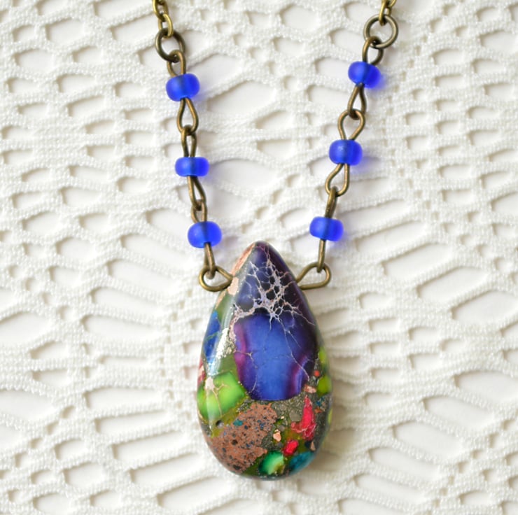 A beautiful necklace featuring a rainbow sea-sediment jasper teardrop with royal blue seed beads and antique-bronze findings.