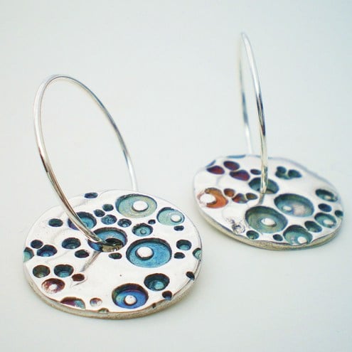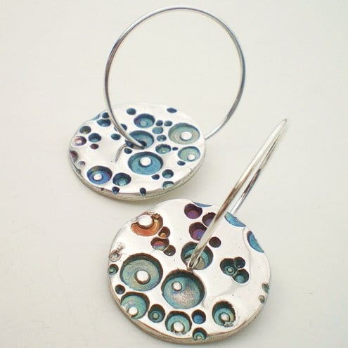 The silver disc measures 1.7cm in diameter, They are hung on 1.8cm diameter sterling silver hoops. The total earring drop is 2.6cm.