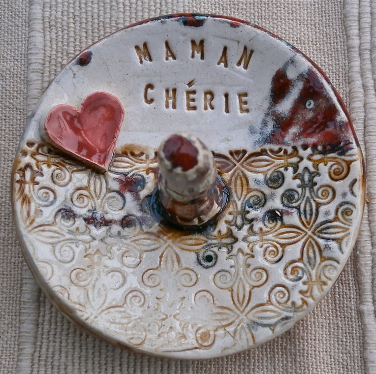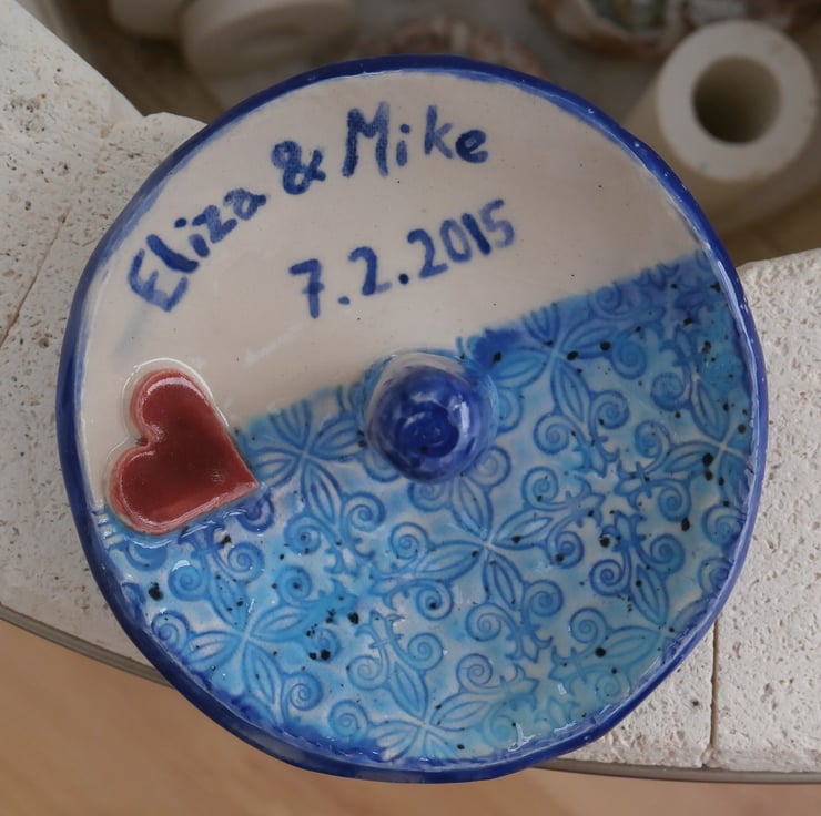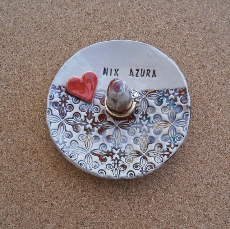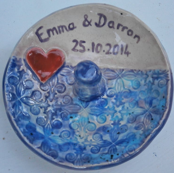Personalised earthenware ring holder with post and heart. Big enough to also hold a pair of earrings, or a bracelet. The one pictured is red, brown and white but other colour combos are available. Maximum 8 characters. Please contact me if you'd like something longer.