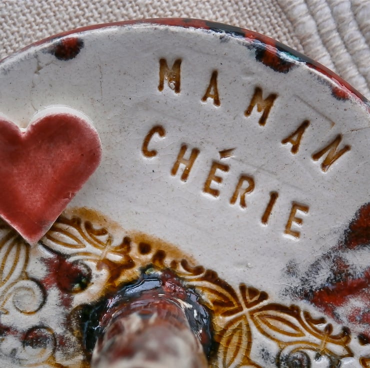 I rolled a slab of clay, cut up a circle, stamped the pattern and added the post and a little heart before shaping the dish in a plant pot saucer. After bisque firing at 1040°C I applied a selection of glazes , then put the dish back in the kiln.