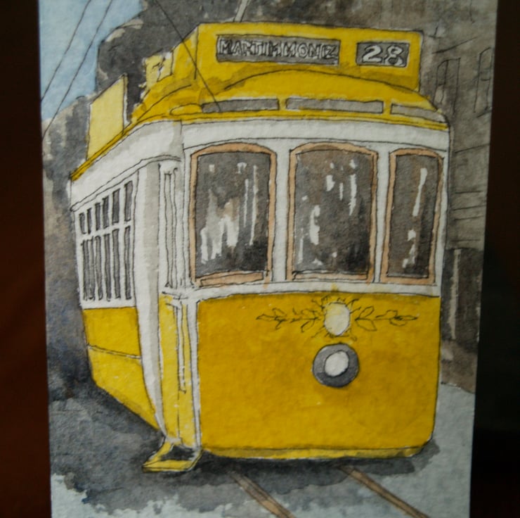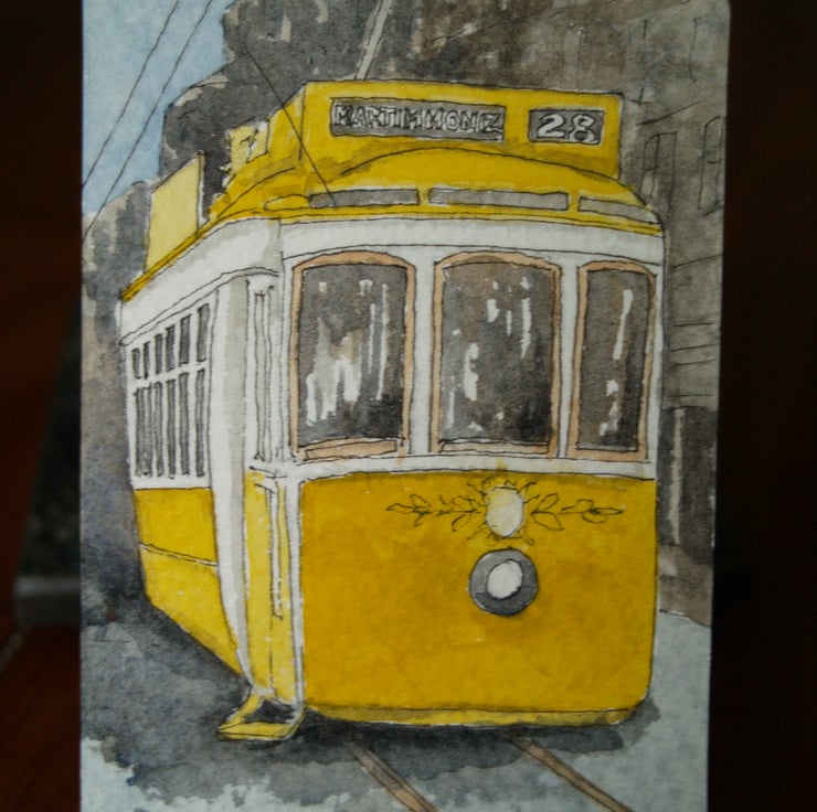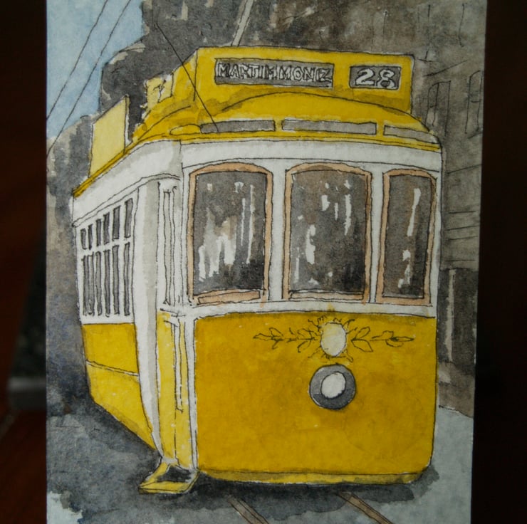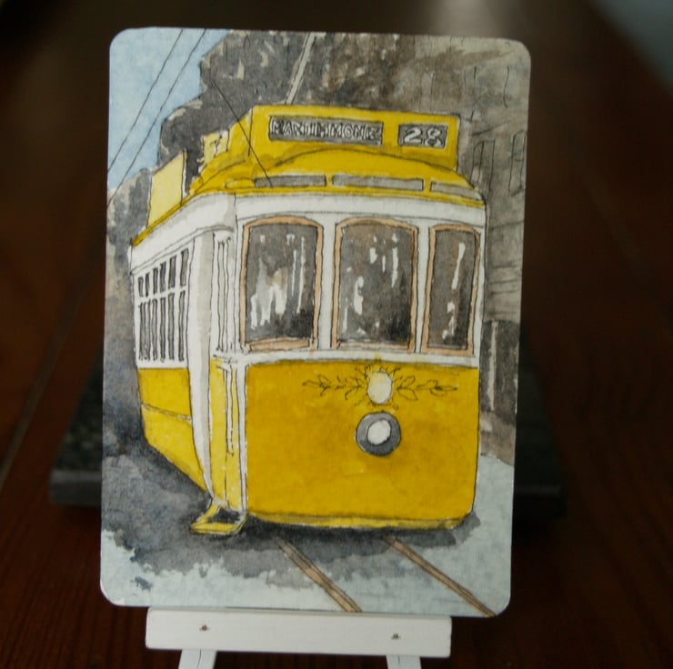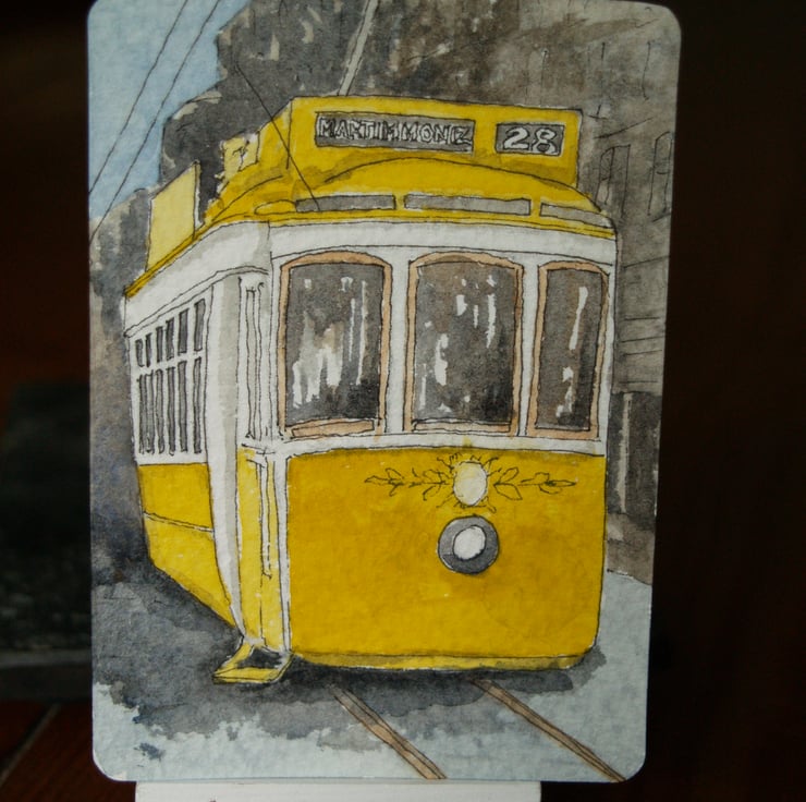 This ACEO is an original, handpainted watercolour of Tram 28, one of the iconic trams in Lisbon. It measures 2.5 x 3.5 inches (63 x 89 mm).