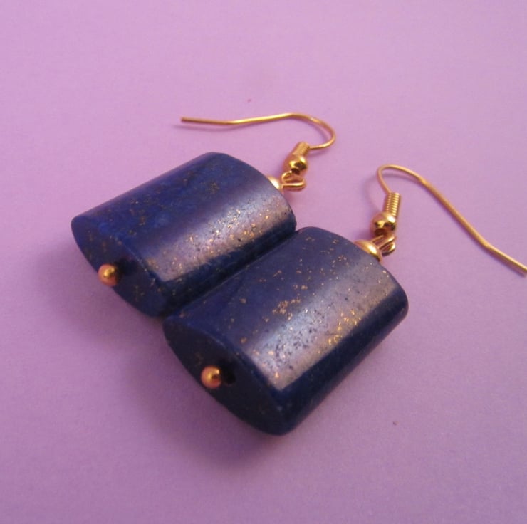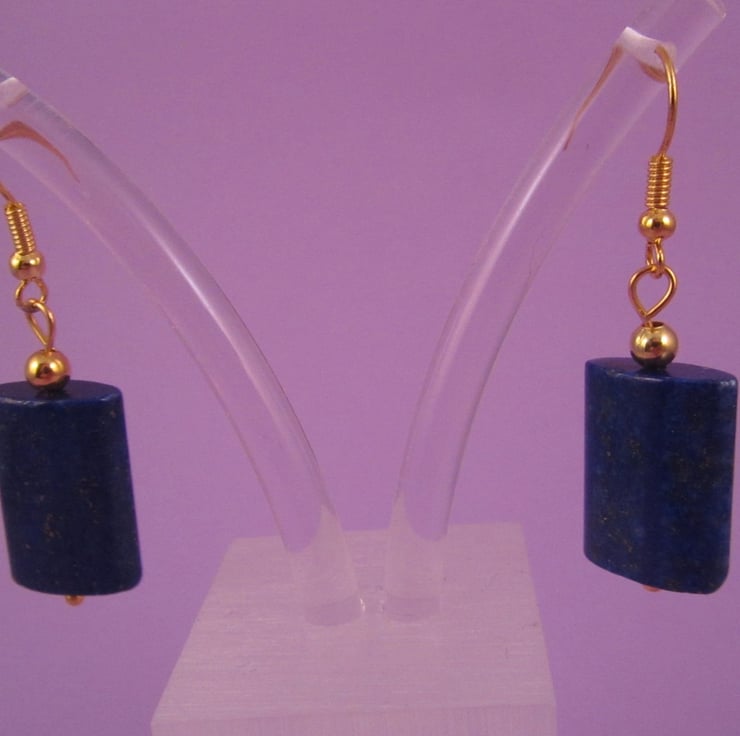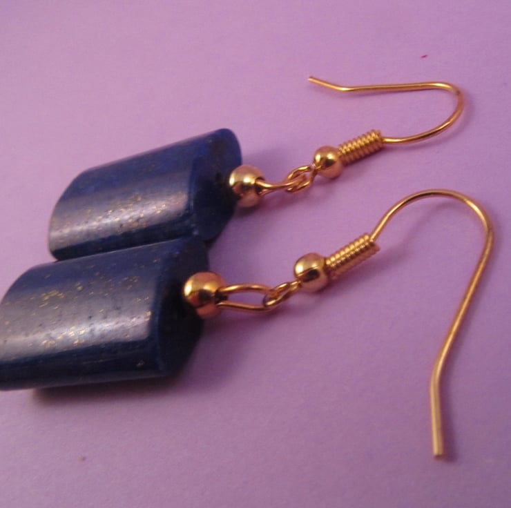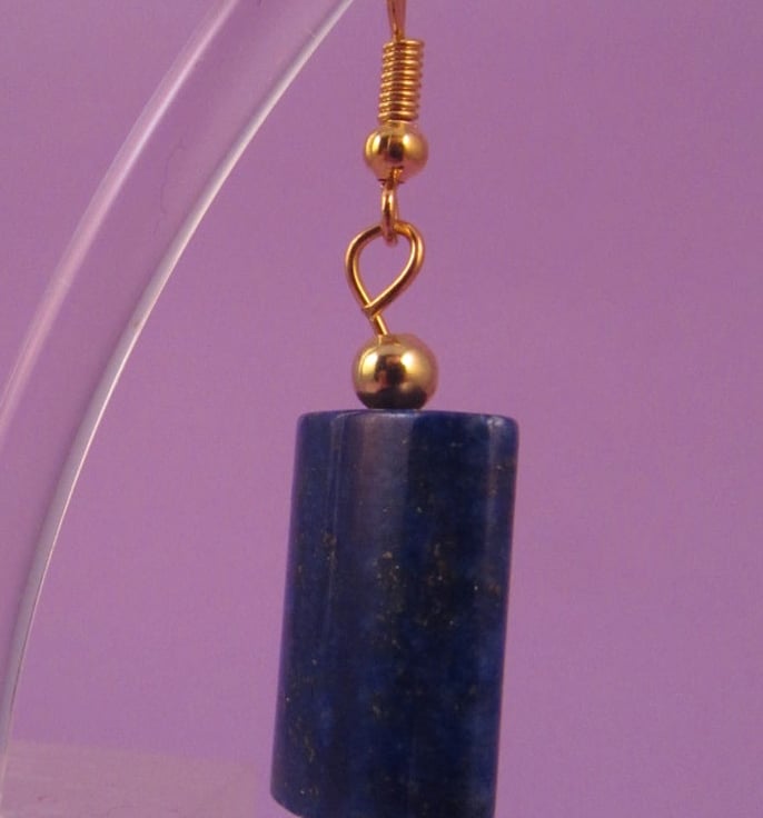 This is a beautiful pair of blue lapis lazuli rectangle dangle earrings. It is created with real dyed blue lapis lazuli gemstones, and gold plated e coated copper. They would look great with jeans or for work.