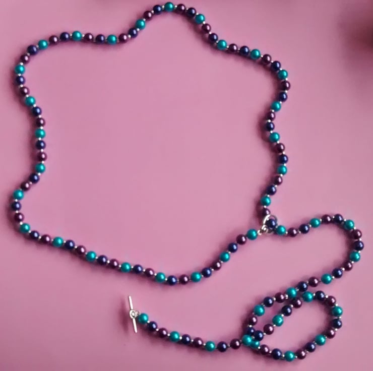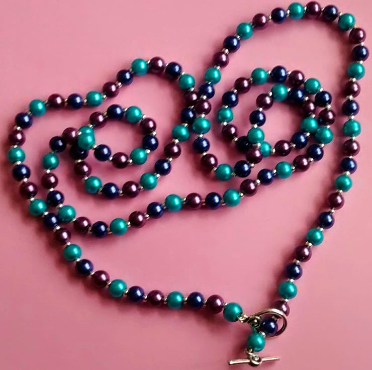 I used turquoise, blue and purple glass pearls offset with silver acrylic spacer beads. The colours are delicious with a slightly different feel to the multi-coloured version.