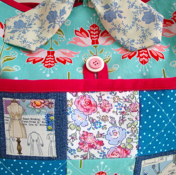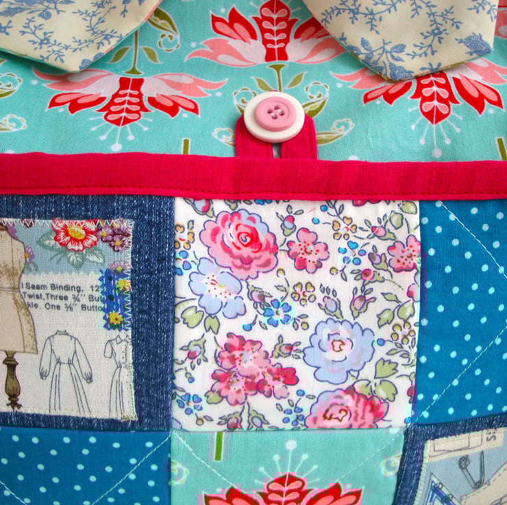With a funky external front patchwork slip pocket - made using various cotton fabrics , loop and button as closure . Also a handy carry strap at the top of bag .