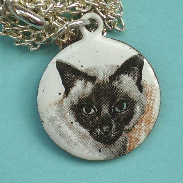 This is a white enamel pendant over which I have fired a transfer picture of a siamese cat. The picture is printed in ink that uses enamel pigments.