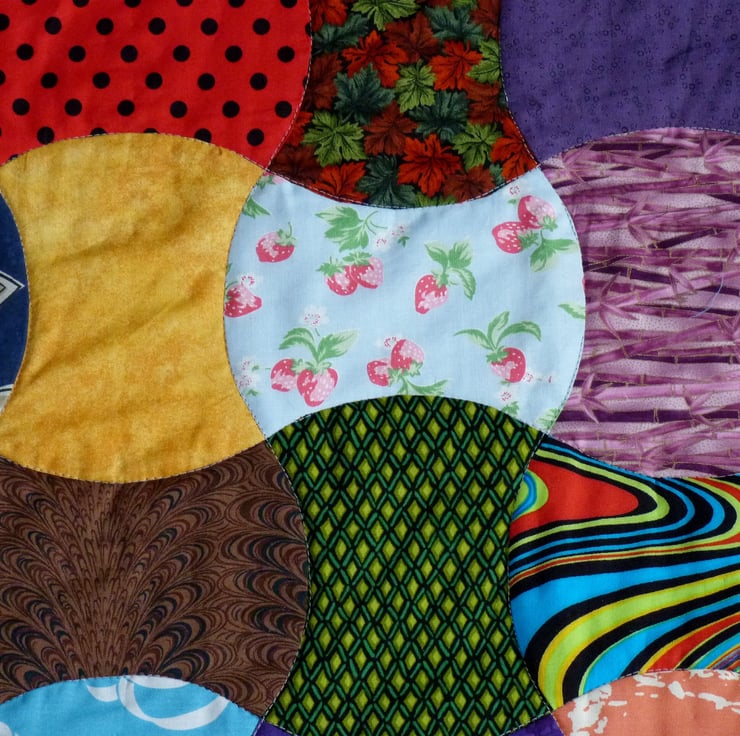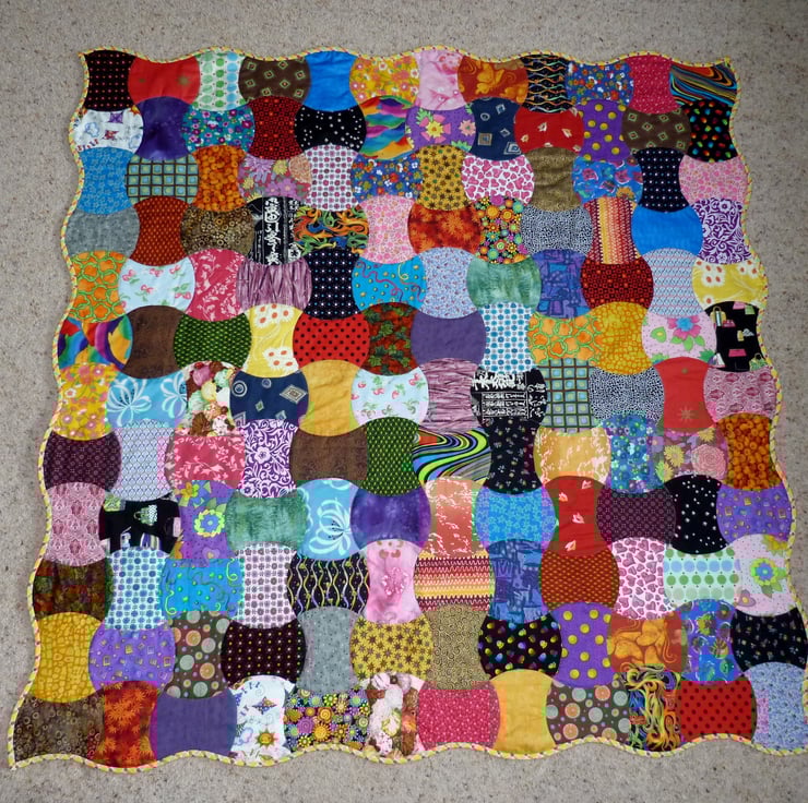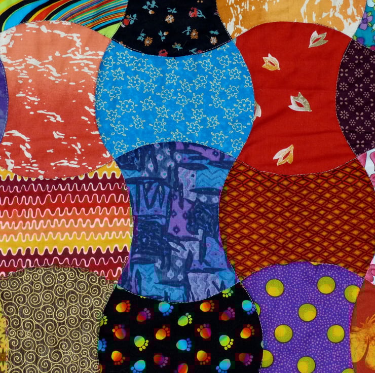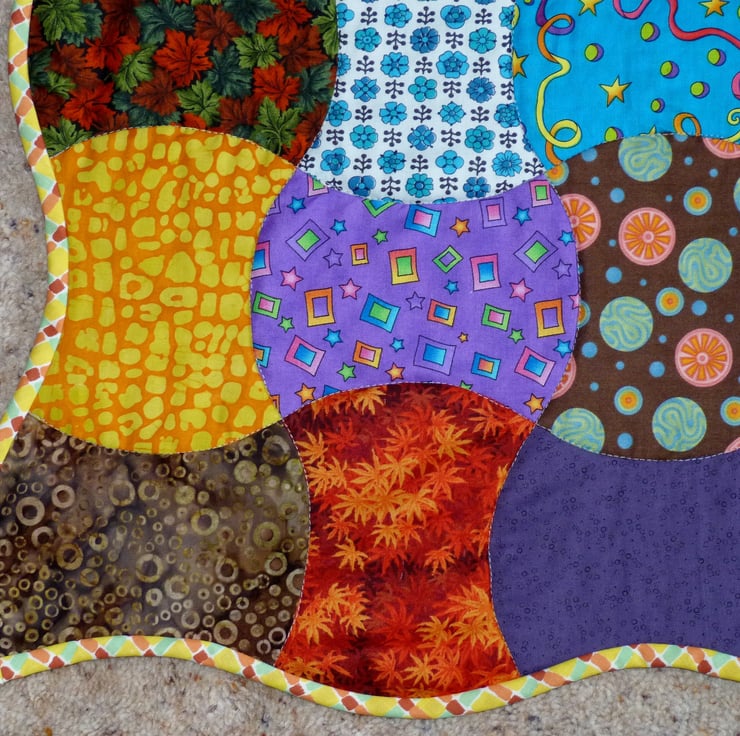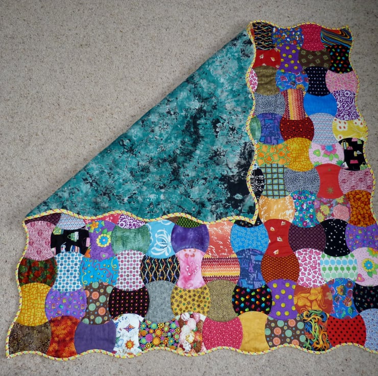 I have machine pieced these apple core shapes into this bright quilt top.The quilt is backed in a green batik print cotton which compliments the quilt top and I have finished the curved edges with bias binding. It has a 2 oz cotton wadding and is machine quilted. with the quilt in the ditch technique.