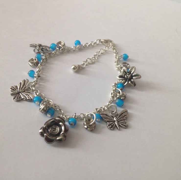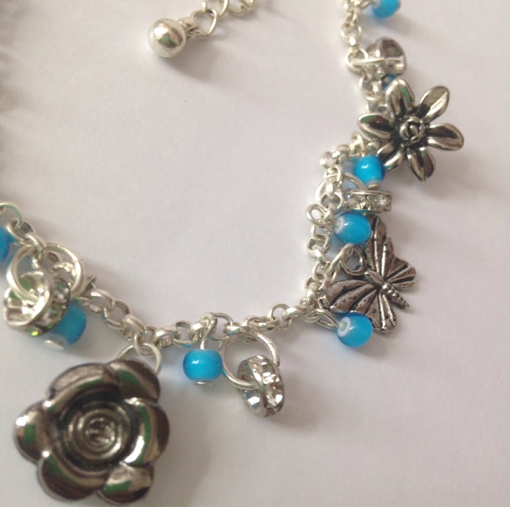 Silver plated charm bracelet with flower and butterfly charms. Also has blue seed beads and silver plated rhinestone disc charms.