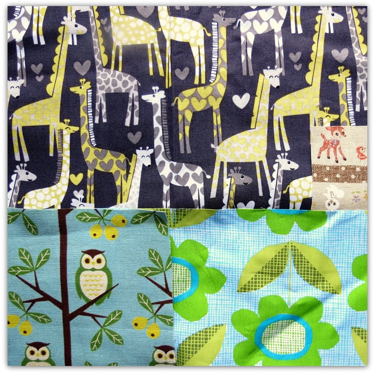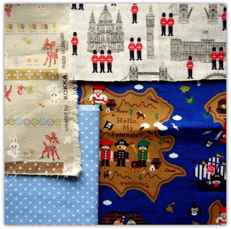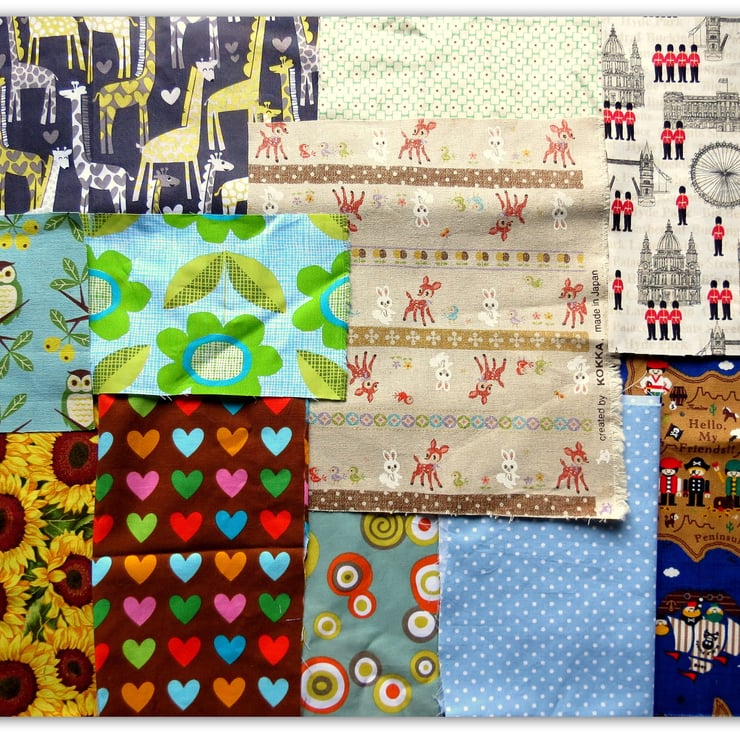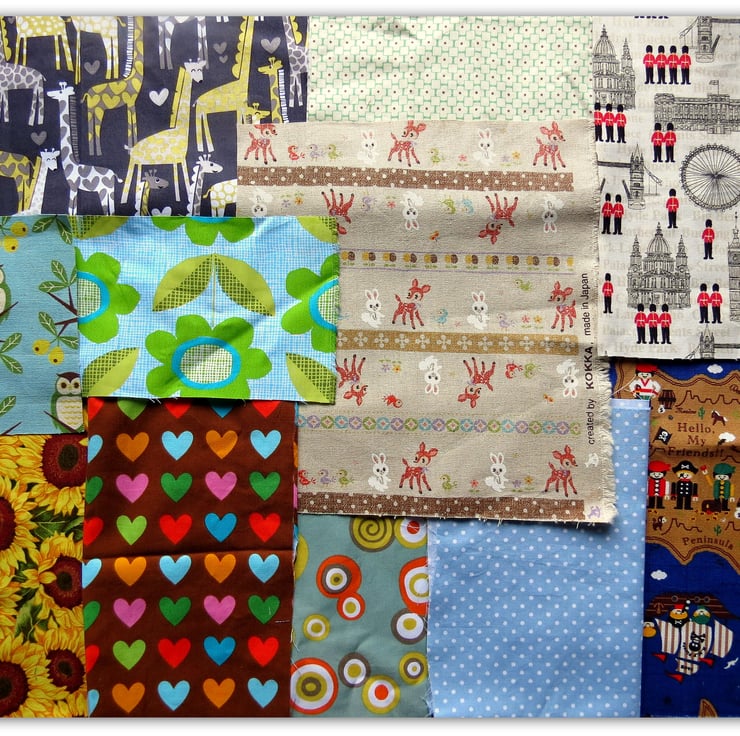 This is a pack of twelve pieces of cotton and cotton/linen mix fabrics, including some whimsical Kokka designs.