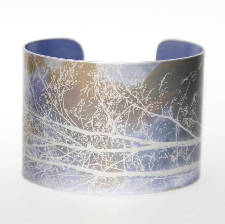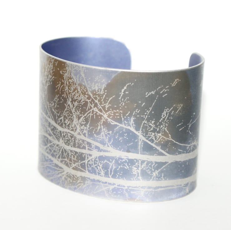 A fab cuff with the lengthways image of a tree silhouette, dyed in purple, bronze and grey. The image is taken from my own photograph. Please note your cuff may vary slightly from the image as each one is dyed by hand.